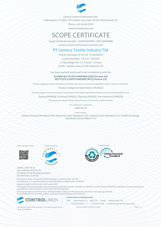 • Sertifikasi lacak balak produk recycled Cert No. CU1031202MUL-2025-00061088.
